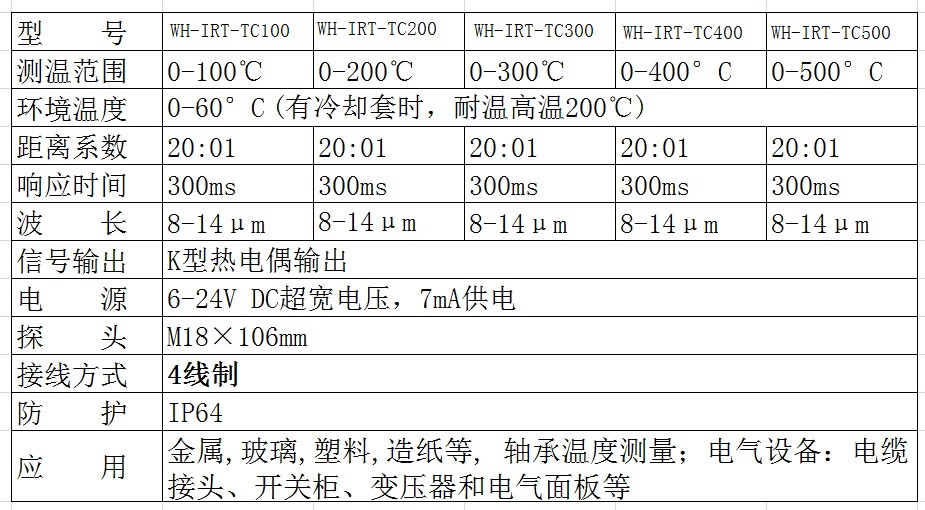 K型输出WH-IRT-TC系列红外线热电偶技术参数